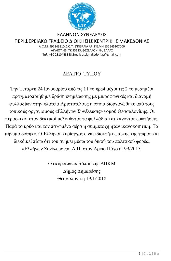 Την Τετάρτη 24 Ιανουαρίου από τις 11 το πρωί μέχρι τις 2 το μεσημέρι πραγματοποιήθηκε δράση ενημέρωσης με μικροφωνικές και διανομή φυλλαδίων στην πλατεία Αριστοτέλους η οποία διοργανώθηκε από τους τοπικούς οργανισμούς «Ελλήνων Συνέλευσις» νομού Θεσσαλονίκης. Οι περαστικοί ήταν δεκτικοί μελετώντας τα φυλλάδια και κάνοντας ερωτήσεις. Παρά το κρύο και τον παγωμένο αέρα η συμμετοχή ήταν ικανοποιητική. Το μήνυμα δόθηκε. Ο Έλληνας κυρίαρχος είναι ιδιοκτήτης αυτής της χώρας και διεκδικεί πίσω ότι του ανήκει μέσω του δικού του πολιτικού φορέα, «Ελλήνων Συνέλευσις», Α.Π. στον Άρειο Πάγο 6199/2015.