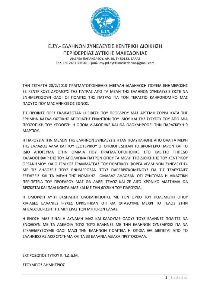 ΤΗΝ ΤΕΤΑΡΤΗ 28/2/2018 ΠΡΑΓΜΑΤΟΠΟΙΗΘΗΚΕ ΜΕΓΑΛΗ ΔΙΑΔΗΛΩΣΗ ΠΟΡΕΙΑ ΕΝΗΜΕΡΩΣΗΣ ΣΕ ΚΕΝΤΡΙΚΟΥΣ ΔΡΟΜΟΥΣ ΤΗΣ ΠΑΤΡΑΣ ΑΠΟ ΤΑ ΜΕΛΗ ΤΗΣ ΕΛΛΗΝΩΝ ΣΥΝΕΛΕΥΣΙΣ ΩΣΤΕ ΝΑ ΕΝΗΜΕΡΩΘΟΥΝ ΟΛΟΙ ΟΙ ΠΟΛΙΤΕΣ ΤΗΣ ΠΑΤΡΑΣ ΓΙΑ ΤΟΝ ΤΕΡΑΣΤΙΟ ΚΛΗΡΟΝΟΜΙΚΟ ΜΑΣ ΠΛΟΥΤΟ ΠΟΥ ΜΑΣ ΑΝΗΚΕΙ ΩΣ ΕΘΝΟΣ. ΤΙΣ ΠΡΩΙΝΕΣ ΩΡΕΣ ΕΚΔΙΚΑΖΟΤΑΝ Η ΕΦΕΣΗ ΤΟΥ ΠΡΟΕΔΡΟΥ ΜΑΣ ΑΡΤΕΜΗ ΣΩΡΡΑ ΚΑΤΑ ΤΗΣ ΕΡΗΜΗΝ ΚΑΤΑΔΙΚΑΣΤΙΚΗΣ ΑΠΟΦΑΣΗΣ ΕΝΑΝΤΙΟΝ ΤΟΥ ΙΔΙΟΥ ΚΑΙ ΤΗΣ ΣΥΖΥΓΟΥ ΤΟΥ ΑΠΟ ΜΙΑ ΠΡΟΣΩΠΙΚΗ ΤΟΥ ΥΠΟΘΕΣΗ Η ΟΠΟΙΑ ΔΙΑΚΟΠΗΚΕ ΚΑΙ ΘΑ ΟΛΟΚΛΗΡΩΘΕΙ ΤΗΝ ΠΑΡΑΣΚΕΥΗ 9 ΜΑΡΤΙΟΥ. Η ΠΑΡΟΥΣΙΑ ΤΩΝ ΜΕΛΩΝ ΤΗΣ ΕΛΛΗΝΩΝ ΣΥΝΕΛΕΥΣΙΣ ΗΤΑΝ ΠΟΛΥΠΛΗΘΗΣ ΑΠΟ ΟΛΑ ΤΑ ΜΕΡΗ ΤΗΣ ΕΛΛΑΔΟΣ ΑΛΛΑ ΚΑΙ ΤΟΥ ΕΞΩΤΕΡΙΚΟΥ ΟΙ ΟΠΟΙΟΙ ΕΔΩΣΑΝ ΤΟ ΒΡΟΝΤΕΡΟ ΠΑΡΟΝ ΚΑΙ ΤΟ ΙΔΙΟ ΑΠΟΓΕΥΜΑ ΣΤΗΝ ΟΜΙΛΙΑ ΠΟΥ ΠΡΑΓΜΑΤΟΠΟΙΗΘΗΚΕ ΣΤΟ ΚΛΕΙΣΤΟ ΓΗΠΕΔΟ ΚΑΛΑΘΟΣΦΑΙΡΙΣΗΣ ΤΟΥ ΑΠΟΛΛΩΝΑ ΠΑΤΡΩΝ ΟΠΟΥ ΤΑ ΜΕΛΗ ΤΗΣ ΔΙΟΙΚΗΣΗΣ ΤΟΥ ΚΕΝΤΡΙΚΟΥ ΟΡΓΑΝΙΣΜΟΥ ΚΑΙ Ο ΓΕΝΙΚΟΣ ΓΡΑΜΜΑΤΕΑΣ ΤΟΥ ΠΟΛΙΤΙΚΟΥ ΦΟΡΕΑ «ΕΛΛΗΝΩΝ ΣΥΝΕΛΕΥΣΙΣ» ΜΕ ΤΙΣ ΔΗΛΩΣΕΙΣ ΤΟΥΣ ΕΝΗΜΕΡΩΣΑΝ ΤΟΥΣ ΠΑΡΕΒΡΙΣΚΟΜΕΝΟΥΣ ΓΙΑ ΤΙΣ ΤΕΛΕΥΤΑΙΕΣ ΕΞΕΛΙΞΕΙΣ ΚΑΙ ΤΑ ΜΕΛΗ ΤΗΣ ΝΟΜΙΚΗΣ ΟΜΑΔΑΣ ΔΗΛΩΣΑΝ ΟΤΙ ΣΥΝΤΟΜΑ Η ΔΙΚΑΣΤΙΚΗ ΠΕΡΙΠΕΤΕΙΑ ΤΟΥ ΠΡΟΕΔΡΟΥ ΜΑΣ ΘΑ ΛΑΒΕΙ ΤΕΛΟΣ ΚΑΙ ΣΕ ΛΙΓΟ ΧΡΟΝΙΚΟ ΔΙΑΣΤΗΜΑ ΘΑ ΒΡΙΣΚΕΤΑΙ ΚΑΙ ΠΑΛΙ ΚΟΝΤΑ ΜΑΣ ΚΑΙ ΜΕ ΤΗΝ ΦΥΣΙΚΗ ΤΟΥ ΠΑΡΟΥΣΙΑ. Η ΟΜΟΡΦΗ ΑΥΤΗ ΕΚΔΗΛΩΣΗ ΟΛΟΚΛΗΡΩΘΗΚΕ ΜΕ ΤΟΝ ΟΡΚΟ ΤΟΥ ΠΟΛΕΜΙΣΤΗ ΟΠΟΥ ΧΙΛΙΑΔΕΣ ΕΛΛΑΝΙΕΣ ΨΥΧΕΣ ΟΡΚΙΣΤΗΚΑΝ ΟΤΙ ΘΑ ΦΤΑΣΟΥΜΕ ΜΕΧΡΙ ΤΟ ΤΕΛΟΣ ΣΤΗΝ ΑΠΕΛΕΦΘΕΡΩΣΗ ΤΗΣ ΜΗΤΕΡΑΣ ΤΩΝ ΜΗΤΕΡΩΝ ΕΛΛΑΣ. Η ΕΝΩΣΗ ΜΑΣ ΕΙΝΑΙ Η ΔΥΝΑΜΗ ΜΑΣ ΚΑΙ ΚΑΛΟΥΜΕ ΟΛΟΥΣ ΤΟΥΣ ΕΛΛΗΝΕΣ ΠΟΛΙΤΕΣ ΝΑ ΕΝΩΘΟΥΝ ΜΕ ΤΑ ΑΔΕΛΦΙΑ ΤΟΥΣ ΤΟΥΣ ΕΛΛΗΝΕΣ ΜΕ ΤΗΝ ΕΛΛΗΝΩΝ ΣΥΝΕΛΕΥΣΙΣ ΓΙΑ ΝΑ ΕΓΚΑΘΙΔΡΥΣΟΥΜΕ ΟΛΟΙ ΜΑΖΙ ΤΗΝ ΕΛΛΗΝΩΝ ΠΟΛΙΤΕΙΑ Η ΟΠΟΙΑ ΘΑ ΔΙΕΠΕΤΑΙ ΑΠΟ ΤΟ ΕΛΛΗΝΙΚΟ ΑΞΙΑΚΟ ΣΥΣΤΗΜΑ ΚΑΙ ΤΑ 33 ΕΛΛΑΝΙΑ ΑΞΙΑΚΑ ΠΡΩΤΟΚΟΛΛΑ.