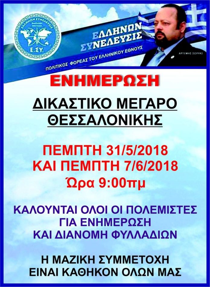 Την Πέμπτη 31/5 και 7/6 από τις 9:00 το πρωί θα πραγματοποιηθεί δράση ενημέρωσης με διανομή έντυπου υλικού έμπροσθεν του δικαστικού μεγάρου Θεσσαλονίκης. Η δράση διοργανώνεται από τους τοπικούς οργανισμούς «Ελλήνων Συνέλευσις» του νομού Θεσσαλονίκης με σκοπό να μεταδοθεί η πληροφορία σε κάθε συμπολίτη μας περί των κληρονομικών κεφαλαίων που είμαστε όλοι τελικοί δικαιούχοι (συνθήκη Bretton Woods ΦΕΚ 315 27/12/1945) τα 600 δις δολάρια που μας κατέθεσε ο Αρτέμης Σώρρας από το 2012 και πιστοποιούνται από 2 δικαστικές αποφάσεις (67650/2013 και 107376/2017) τους στόχους και σκοπούς ίδρυσης των γραφείων «Ελλήνων Συνέλευσις» και το πώς ο Έλληνας θα ανακτήσει την Εθνική του Κυριαρχία την οποία παρέδωσαν όλα τα κόμματα με νόμο (ΦΕΚ Α18 25/1/2013 σελίδες 355-356) μέσω της συμμετοχής του στον πολιτικό φορέα του Έθνους των Ελλήνων , «Ελλήνων Συνέλευσις» (Αριθμός πρωτοκόλλου 6199 4/9/2015 στον Άρειο Πάγο)