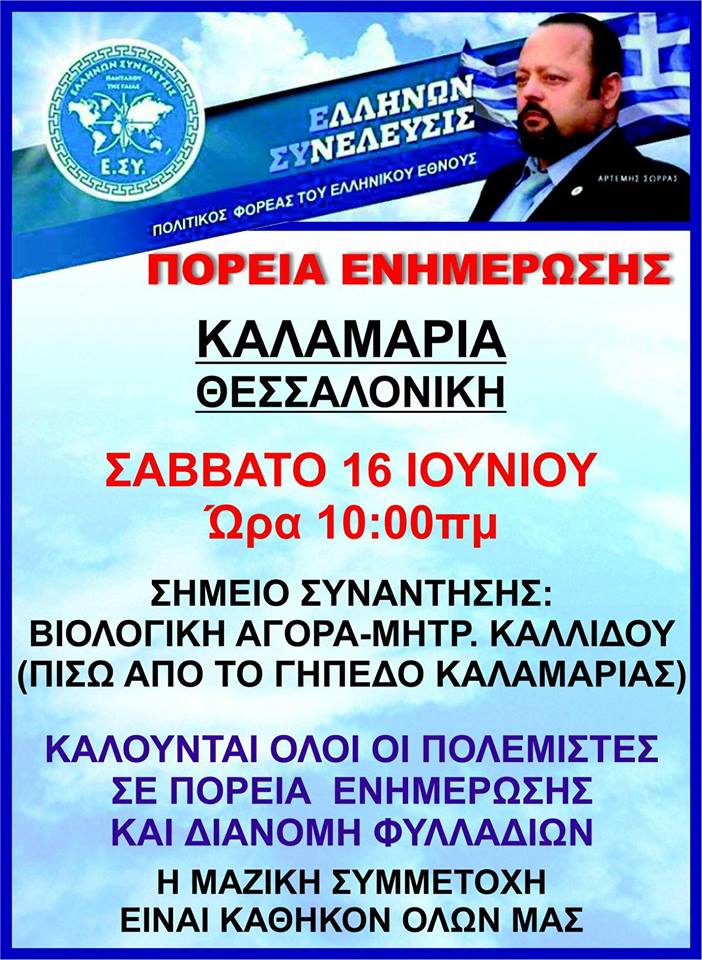 Το Σάββατο 16 Ιουνίου 2018 από τις 10 το πρωί θα πραγματοποιηθεί ενημερωτική δράση με διανομή έντυπου υλικού και χρήση μικροφωνικής με ηχεία στην Καλαμαριά με σημείο έναρξης την βιολογική αγορά στην οδό Μητροπολίτου Καλλίδου (πίσω από το γήπεδο του Απόλλωνα Καλαμαριάς). Η δράση διοργανώνεται από τον τοπικό οργανισμό «Ελλήνων Συνέλευσις Καλαμαριάς».