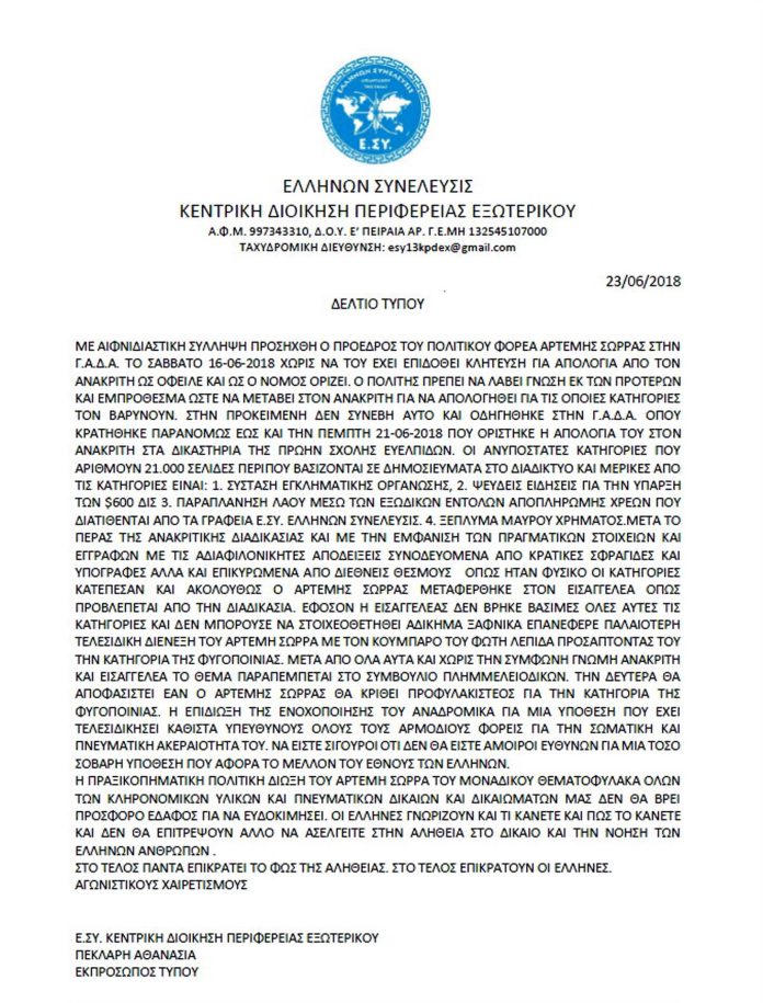 ΜΕ ΑΙΦΝΙΔΙΑΣΤΙΚΗ ΣΥΛΛΗΨΗ ΠΡΟΣΗΧΘΗ Ο ΠΡΟΕΔΡΟΣ ΤΟΥ ΠΟΛΙΤΙΚΟΥ ΦΟΡΕΑ ΑΡΤΕΜΗΣ ΣΩΡΡΑΣ ΣΤΗΝ Γ.Α.Δ.Α. ΤΟ ΣΑΒΒΑΤΟ 16-06-2018 ΧΩΡΙΣ ΝΑ ΤΟΥ ΕΧΕΙ ΕΠΙΔΟΘΕΙ ΚΛΗΤΕΥΣΗ ΓΙΑ ΑΠΟΛΟΓΙΑ ΑΠΟ ΤΟΝ ΑΝΑΚΡΙΤΗ ΩΣ ΟΦΕΙΛΕ ΚΑΙ ΩΣ Ο ΝΟΜΟΣ ΟΡΙΖΕΙ.