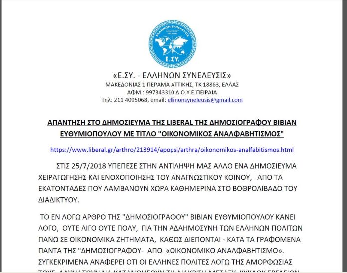 ΑΠΑΝΤΗΣΗ ΣΤΟ ΔΗΜΟΣΙΕΥΜΑ ΤΗΣ LIBERAL ΤΗΣ ΔΗΜΟΣΙΟΓΡΑΦΟΥ ΒΙΒΙΑΝ ΕΥΘΥΜΙΟΠΟΥΛΟΥ ΜΕ ΤΙΤΛΟ “ΟΙΚΟΝΟΜΙΚΟΣ ΑΝΑΛΦΑΒΗΤΙΣΜΟΣ”