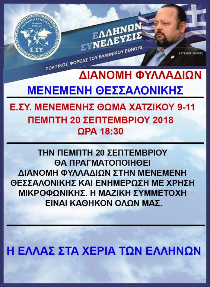 Την Πέμπτη 20 Σεπτεμβρίου θα πραγματοποιηθεί δράση ενημέρωσης με διανομή φυλλαδίων και πορεία στην Μενεμένη Θεσσαλονίκης με σημείο συνάντησης τον τοπικό οργανισμό «Ε.ΣΥ. Μενεμένης» στις 6:30 το απόγευμα.