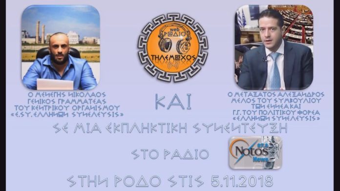 Ε.ΣΥ. ΕΛΛΗΝΩΝ ΣΥΝΕΛΕΥΣΙΣ ΟΙ ΓΕΝΙΚΟΙ ΓΡΑΜΜΑΤΕΙΣ ΤΟΥ ΚΕΝΤΡΙΚΟΥ ΟΡΓΑΝΙΣΜΟΥ ΚΑΙ ΤΟΥ ΠΟΛΙΤΙΚΟΥ ΦΟΡΕΑ ΝΙΚΟΣ ΜΕΝΕΓΗΣ ΚΑΙ ΑΛΕΞΑΝΔΡΟΣ ΜΕΤΑΞΑΤΟΣ ΣΤΟ ΡΑΔΙΟ ΝΟΤΟΣ ΣΤΗΝ ΡΟΔΟ 5-11-2018