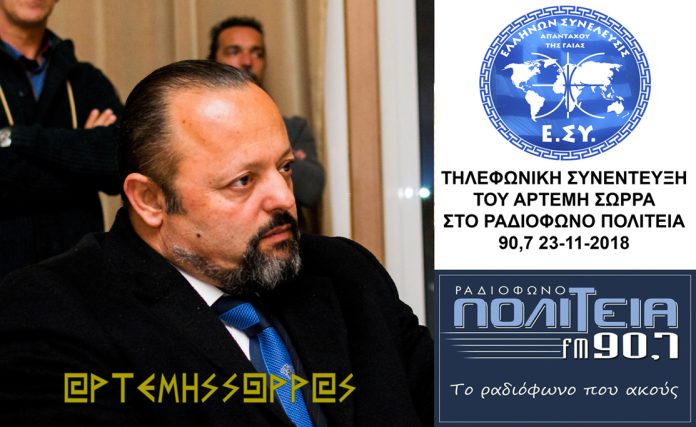 Ο ΑΡΤΕΜΗΣ ΣΩΡΡΑΣ ΠΡΟΕΔΡΟΣ ΤΟΥ ΠΟΛΙΤΙΚΟΥ ΦΟΡΕΑ ΕΛΛΗΝΩΝ ΣΥΝΕΛΕΥΣΙΣ ΣΤΟ ΡΑΔΙΟ ΠΟΛΙΤΕΙΑ 90,7 ΠΑΡΑΣΚΕΥΗ 23 ΝΟΕΜΒΡΙΟΥ 2018