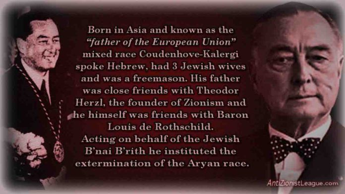 Ο Coudenhove Kalergi Οι γονείς του ήταν Αυστριακός και Γιαπωνέζα! Η οικογένειά του έχει ρίζες από Βέλγιο, Ελλάδα, Πολωνία, Νορβηγία, Γαλλία και Γερμανία. Ο Coudenhove-Kalergi, σπούδασε στην Βιέννη και στο Πανεπιστήμιό της έγινε διδάκτωρ. Παντρεύτηκε την 13 χρόνια μεγαλυτερή του εβραία Ida Roland[born Ida Klausner] δημοφιλή ηθοποιό με την οποία απέκτησε δύο γυιούς. Η Ida Roland πέθανε το 1951. Το 1952 παντρεύτηκε την Alexandra Gräfin von Tiele, born Bally. Το 1969 παντρεύτηκε την Αυστροεβραία Melanie Benatzky Hoffmann. Ο Count R. N. Courdenhove-Kalergi θεωρείται από πολλούς ως ο πατέρας της σύγχρονης Ευρωπαικής Ενωσης. Ηταν αυτός που πρότεινε τον ύμνο του Μπετόβεν για εθνικό ύμνο της ΕΕ και συμμετείχε δραστήρια στον σχεδιασμό του λογότυπου της ΕΕ που περιέχει 12 αστέρια συμβολίζοντα τις 12 φυλές του Ισραήλ.Το λογότυπο ολοκληρώθηκε απο τον εβραίο Paul M.G. Lévi.
