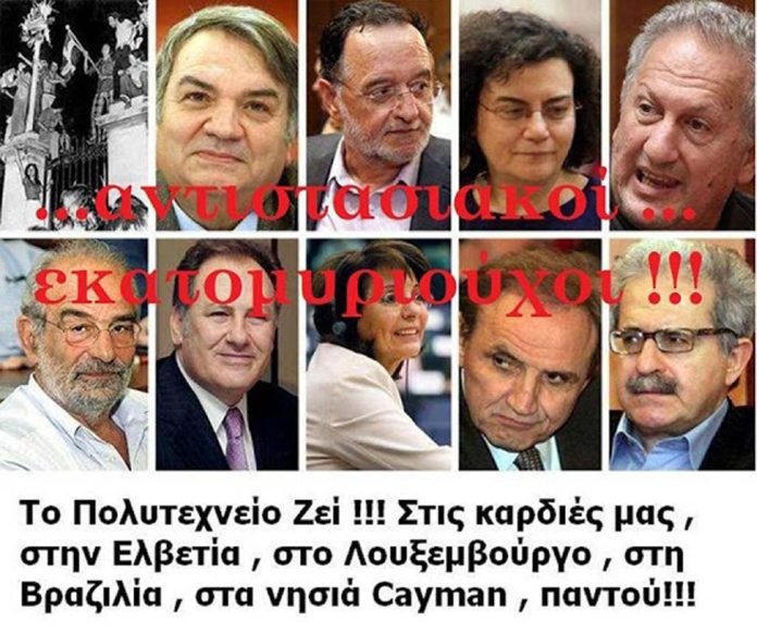 Οι …«ήρωες» του Πολυτεχνείου ήταν αυτοί που μας έβαλαν ακόμα πιο βαθειά στον βούρκο της Νέας Τάξεως και η Νέα Τάξη τους προστάτεψε, τους πλούτισε, τους δόξασε και τους επέτρεψε να νομοθετήσουν την διαιώνιση των μύθων του Πολυτεχνείου, την συσκότιση γύρω από την δράση των ξένων αφεντικών που βοήθησαν στην …«απελευθέρωσή» μας και την υποχρεωτική τίμησή τους εις τους αιώνας των αιώνων.