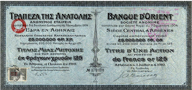 Η «Τράπεζα της Ανατολής (Banque d’ Orient)» είχε ιδρυθεί το 1904 από την Εθνική Τράπεζα Ελλάδος (50%) και την Εθνική Τράπεζα Γερμανίας (50 %) και απορροφήθηκε το 1932 από την Εθνική Τράπεζα Ελλάδος.