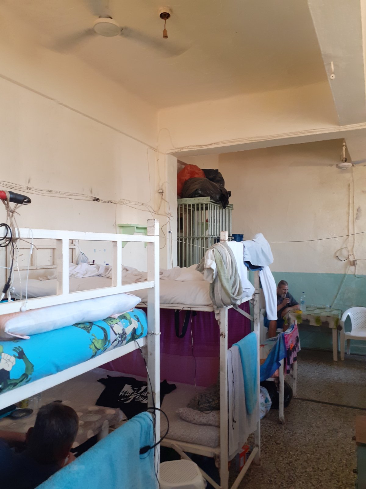 Επισκεφτήκαμε τα μαγειρεία, το χώρο του κλειστού και του «ανοιχτού» επισκεπτηρίου καθώς και έναν αποπνικτικό θάλαμο περίπου 40τμ στον οποίο υπήρχε το αδιαχώρητο, καθώς είναι στοιβαγμένα συνολικά 22 άτομα σε κουκέτες τη μία δίπλα στην άλλη αλλά και στον διάδρομο, με ελάχιστο ελεύθερο χώρο για να κινηθούν και ελάχιστο αέρα. Ένα πανί κρεμασμένο με μανταλάκια σε κάθε κουκέτα, εξασφαλίζει μια υποτιθέμενη ιδιωτικότητα.