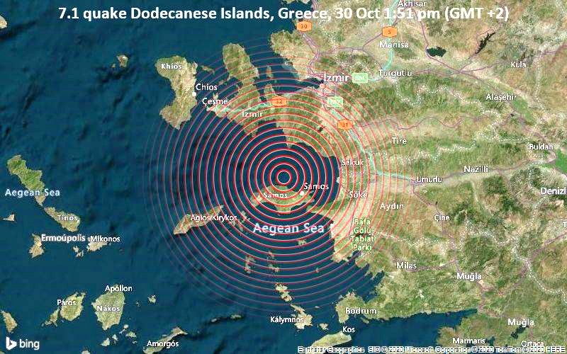 Ενας σεισμός μεγέθους 7,1 χτύπησε κοντά στο νησί της Σάμου, στην Ελλάδα. Ο τρόμος καταγράφηκε περίπου το μεσημέρι την Παρασκευή 30 Οκτωβρίου 2020 στις 1.51 μ.μ. τοπική ώρα, σε ρηχό βάθος 10 χλμ κάτω από την επιφάνεια.