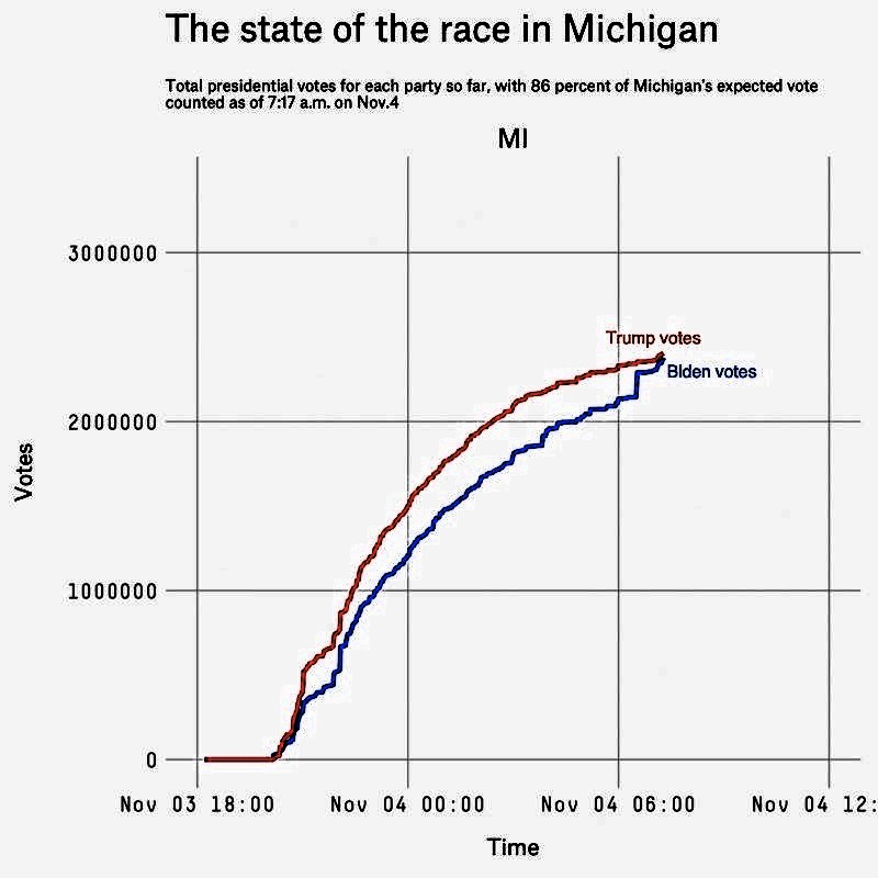 Σημειώστε επίσης ότι ακριβώς το ίδιο συνέβη περίπου την ίδια στιγμή στο γειτονικό Ουισκόνσιν. Έτσι είχαμε δύο ταυτόχρονα “σφάλματα εισαγωγής δεδομένων”, σε δύο κρίσιμες αμφισβητούμενες πολιτείες, που εξάλειψαν το προβάδισμα του Τραμπ; Πόσο είναι αυτό πιθανό;