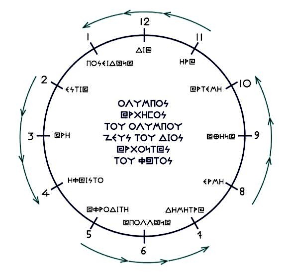 ΒΛΕΠΟΥΜΕ 2 ΔΥΟ ΚΥΚΛΙΚΑ ΣΧΗΜΑΤΑ ΜΕ ΤΟΥΣ 12 ΔΩΔΕΚΑ ΟΛΥΜΠΙΟΥΣ ΜΕ ΤΑ 12 ΥΠΕΡΚΩΔΙΚΑ ΟΝΟΜΑΤΑ ΤΟΥΣ, ΟΠΟΥ ΣΤΟ 1ο ΣΧΗΜΑ ΕΧΟΥΝ ΔΕΞΙΟΣΤΡΟΦΗ ΤΡΟΧΙΑ ΕΝΩ ΣΤΟ 2ο ΣΧΗΜΑ ΕΧΟΥΝ ΑΡΙΣΤΕΡΟΣΤΡΟΦΗ ΤΡΟΧΙΑ.