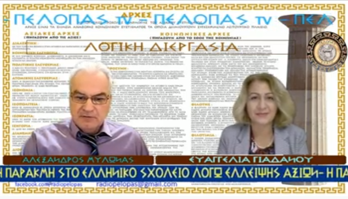 ΣΤΗΝ ΕΚΠΟΜΠΗ “ΛΟΓΙΚΗ ΔΙΕΡΓΑΣΙΑ” ΜΕ ΤΟΝ ΑΛΕΞΑΝΔΡΟ ΜΥΛΩΝΑ ΠΕΛΟΠΑΣ ΡΑΔΙΟ-WEB TV Η ΕΥΑΓΓΕΛΙΑ ΓΙΑΔΑΝΟΥ,ΥΠ. ΒΟΥΛΕΥΤΗΣ ΡΟΔΟΠΗΣ ΕΛΛΗΝΩΝ ΣΥΝΕΛΕΥΣΙΣ ΜΑΣ ΜΙΛΑ ΓΙΑ ΤΗΝ ΥΠΟΒΑΘΜΙΣΗ ΤΩΝ ΑΞΙΩΝ ΣΤΟ ΔΗΜΟΣΙΟ ΣΧΟΛΕΙΟ. ΜΕ ΑΦΟΡΜΗ ΤΟ ΣΥΜΒΑΝ ΤΗΣ ΧΕΙΡΟΔΙΚΙΑΣ ΚΑΘΗΓΗΤΗ ΕΠΑΛ ΑΘΗΝΩΝ ΣΕ ΒΑΡΟΣ ΜΑΘΗΤΡΙΑΣ ΓΙΝΕΤΑΙ Η ΕΚΘΕΣΗ ΤΗΣ ΕΛΛΕΙΨΗΣ ΑΡΧΩΝ, ΑΞΙΩΝ ΚΑΙ ΝΟΜΩΝ ΣΤΟ ΕΛΛΗΝΙΚΟ ΣΧΟΛΕΙΟ ΚΑΙ ΣΤΗΝ ΕΛΛΗΝΙΚΗ ΟΙΚΟΓΕΝΕΙΑ.