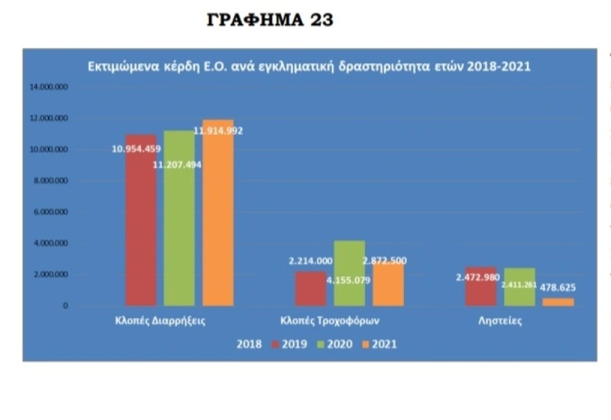 Στο γράφημα 23 βλέπετε τα εκτιμώμενα κέρδη των εγκληματικών ομάδων ανά εγκληματική δραστηριότητα για τα έτη 2018-2021. Αυτά υπερβαίνουν τα 15 εκατομμύρια ευρώ.
