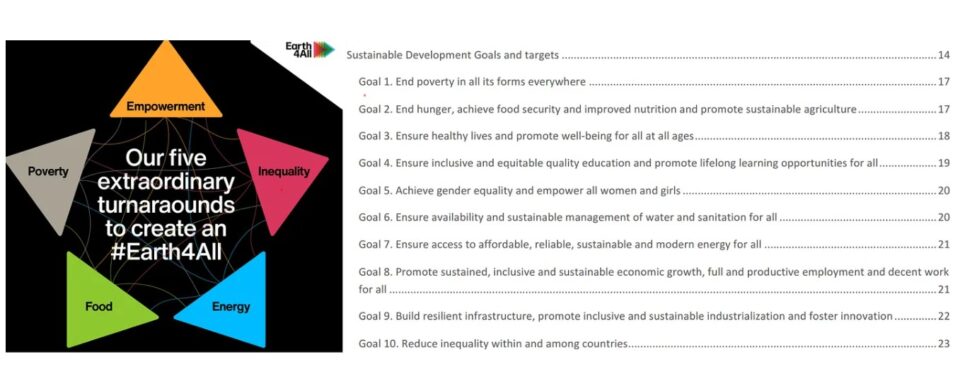 Η Earth4All δεν είναι περιθωριακός οργανισμός. Δημιούργησε τις ιδέες που καθοδήγησαν το Παγκόσμιο Οικονομικό Φόρουμ και τα Ηνωμένα Έθνη. Συγκρίνετε, για παράδειγμα, το σχέδιο Giant Leap της Earth4All (στα αριστερά) με τους “Στόχους Βιώσιμης Ανάπτυξης” του ΟΗΕ (στα δεξιά).