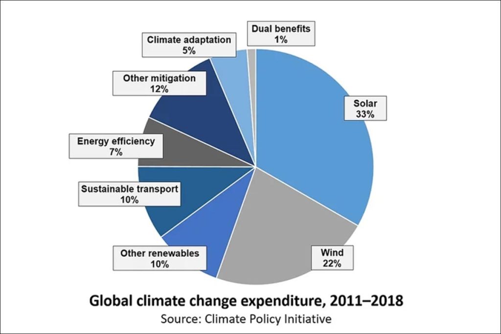 Παραδόξως, πάνω από το ήμισυ (55%) του συνόλου των παγκόσμιων δαπανών για το κλίμα κατά τα έτη 2011-2018 δαπανήθηκαν για την ηλιακή και την αιολική ενέργεια – συνολικά 2.000 δισεκατομμύρια δολάρια. Παρόλα αυτά, η αιολική και η ηλιακή ενέργεια εξακολουθούν να παράγουν μόνο το 3% της παγκόσμιας κατανάλωσης ενέργειας το έτος 2018, ενώ τα ορυκτά καύσιμα (πετρέλαιο, άνθρακας και φυσικό αέριο) παρήγαγαν το 85%. Αυτό εγείρει πιεστικά ερωτήματα σχετικά με το πόσο θα κόστιζε η μετάβαση σε 100% ανανεώσιμες πηγές ενέργειας, όπως προτείνουν ορισμένοι ερευνητές.