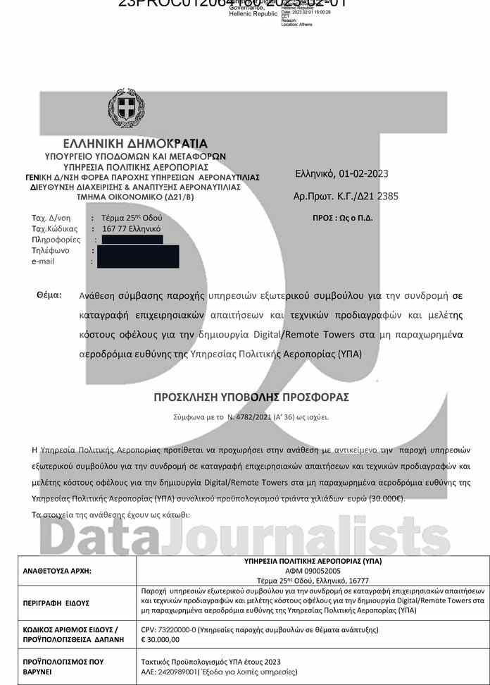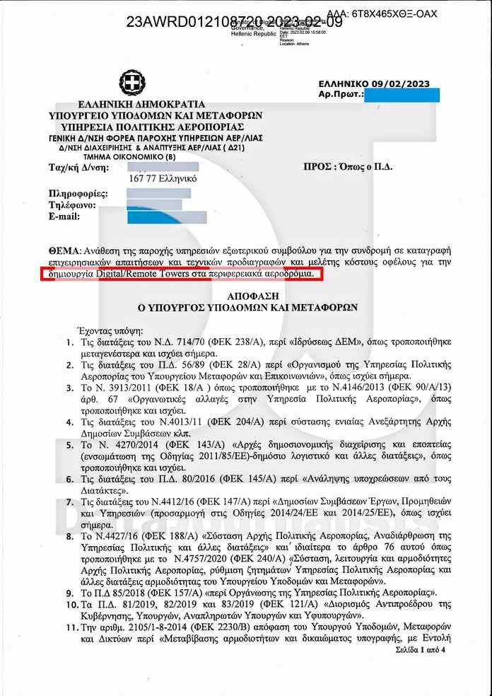 - – Στις 24 Ιανουαρίου 2023 δημοσιεύεται απόφαση στην Διαύγεια με την οποία η διοίκηση της ΥΠΑ εγκρίνει «τη διαδικασία σύναψης δημόσιας σύμβασης παροχής υπηρεσιών εξωτερικού συμβούλου για την συνδρομή σε καταγραφή επιχειρησιακών απαιτήσεων και τεχνικών προδιαγραφών και μελέτης κόστους οφέλους για την δημιουργία Digital/Remote Towers». Προσοχή, όμως, η απόφαση εκείνη έλεγε ότι η μελέτη θα αφορά «στα μη παραχωρημένα αεροδρόμια» ευθύνης της ΥΠΑ.