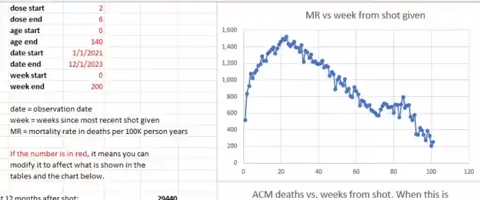αφορά όλες τις ηλικίες και όλες τις δόσεις, βλέπουμε ότι το ποσοστό θνησιμότητας αυξάνεται κατά 49% από την εβδομάδα 5 (1.020) στην εβδομάδα 23 (1.520). Αυτή είναι μια εκπληκτική αύξηση σε λιγότερο από 5 μήνες. Μια σταθερή κοόρτη (μείγμα ηλικίας) για 6 μήνες που κάνει την κοόρτη να είναι ελαφρώς μικρότερη με την πάροδο του χρόνου, κάνει την τεράστια θνησιμότητα που αυξάνεται ακόμη πιο ανεξήγητη).