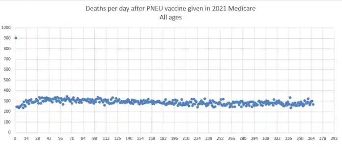 Αυτή είναι η καμπύλη εμβολίου του πνευμονιόκοκκου από τη Medicare το 2021. Για όλες τις ηλικίες. Εξετάζει άτομα που εμβολιάστηκαν κάποια στιγμή το 2021 για 1 χρόνο μετά τον εμβολιασμό για να δει πόσοι πέθαναν.