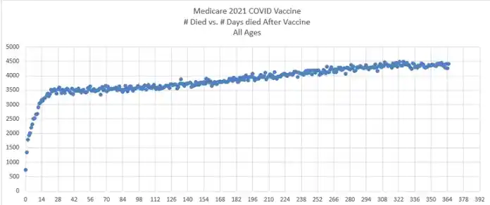 Εάν κάνετε μια απλή γραφική παράσταση του απόλυτου αριθμού θανάτων ανά ημέρα μετά τη χορήγηση του εμβολίου σε σχέση με τον αριθμό των ημερών που έχουν περάσει από την εμβολιασμό, εκτός από μια σύντομη περίοδο 21 ημερών μετά τον εμβολιασμό, ο αριθμός των θανάτων ανά ημέρα θα έπρεπε να μειώνεται με την πάροδο του χρόνου, αυτό τουλάχιστον για ένα ασφαλές εμβόλιο.