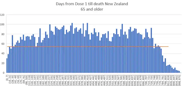 Το ίδιο αποτέλεσμα παρατηρείται στην Νέα Ζηλανδία για τους 65 ετών και άνω και η θνησιμότητα αυξάνεται για 400 ημέρες μετά την δόση (δημιουργώντας νέα υψηλά).