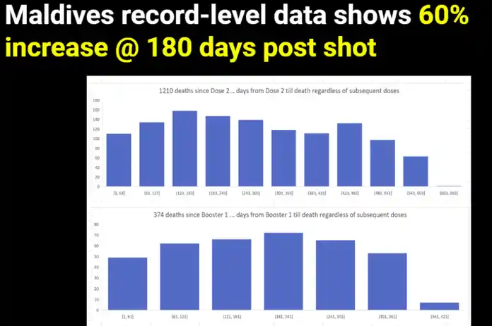 Ωστόσο, οι καμπύλες των θανάτων μετά τη πρώτη δόση είναι όλες αφού υπήρχαν ήδη οι θάνατοι από τον COVID, επομένως η κλίση μετά την πρώτη δόση προς τα πάνω δεν μπορεί να εξηγηθεί με τον COVID. Το σχήμα της καμπύλης θανάτου του COVID δεν αυξάνεται αλλά είναι σχετικά επίπεδο.