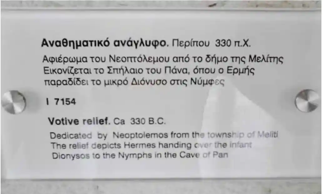 Το συγκεκριμένο γλυπτό ανάγλυφο απεικονίζει αφιέρωμα του Νεοπτόλεμου από τον δήμο Μελίτης και χρονολογείται περίπου στο 330 π.Χ.