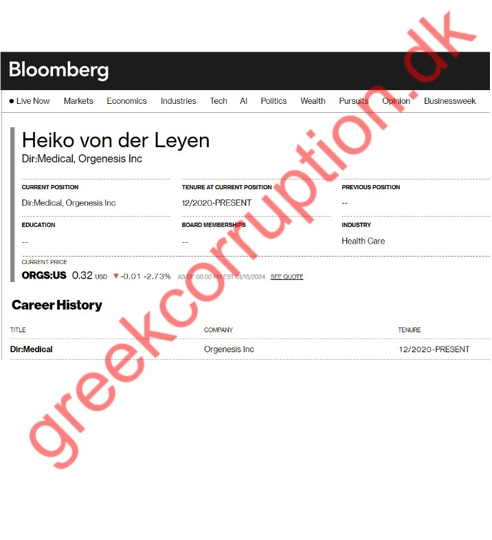 Κι αυτό γιατί στην Orgenesis Inc είναι στέλεχος ο Χάικε φον ντερ Λάιεν, σύζυγος της προέδρου της Ευρωπαϊκής Επιτροπής, Ούρσουλα φον ντερ Λάιεν. Αξίζει μάλιστα να επισημανθεί πως η συγκεκριμένη εταιρία στελεχώθηκε από πρώην εργαζoμένους της Pfizer, ενώ και οι βασικοί μέτοχοί της είναι οι ίδιοι με αυτούς του φαρμακευτικού κολοσσού που θησαύρισε από τα γνωστά εμβόλια για τον κορωνοϊό.