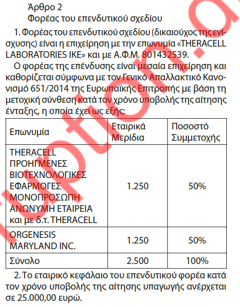 Η Ελληνική Κυβέρνηση έδωσε € 31.728.747,00 Επιχορήγηση για δαπάνες έρευνας και ανάπτυξης σε μία εταιρεία με την επωνυμία THERACELL LABORATORIES ΙΔΙΩΤΙΚΗ ΚΕΦΑΛΑΙΟΥΧΙΚΗ ΕΤΑΙΡΕΙΑ, της οποίας μέτοχος κατά 50% είναι η εταιρία Orgenesis.