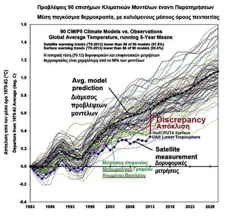 διαπιστώνεται αὐτή αὐξήθηκε μόλις κατά 0,35°C εἰς μίαν περίοδον τριακονταετίας 1983-2013 καὶ ὄχι κατά 0,6°C ὄπως “προβλέπουσι” τα κλιματικά μοντέλα, τα ὁποία συνεχίζουσι τας δῆθεν προβλέψεις μέχρι το 2028 ἐμφανίζοντας αὐξήσεις μέχρι και 1°C ἤ και μεγαλυτέρας, ὄταν ἀπό το 1988 ἔως το 2014 δεν παρατηρεῖται πλέον αὔξησις τῆς μέσης θερμοκρασίας τῆς γῆς.