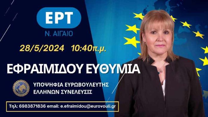 Η Υποψήφια Ευρωβουλευτής με τον Πολιτικό Φορέα Ελλήνων Συνέλευσις Ευθυμία (Έφη) Εφραιμίδου στην ΕΡΤ Νοτίου Αιγαίου την Τρίτη 28 Μαίου 2024.