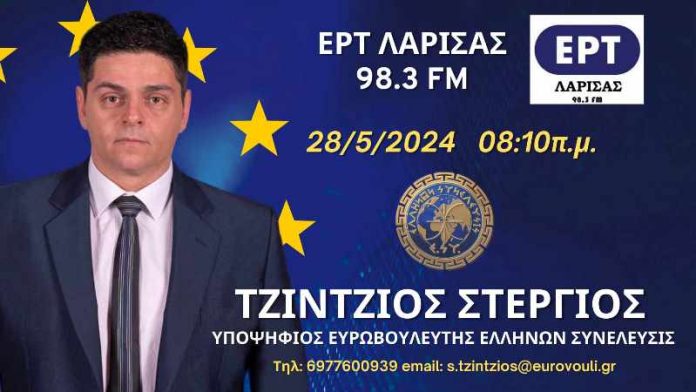Ο Υποψήφιος Ευρωβουλευτής με τον Πολιτικό Φορέα Ελλήνων Συνέλευσις Στέργιος Τζίντζιος στην ΕΡΤ Λάρισας την Τρίτη 28 Μαίου 2024.