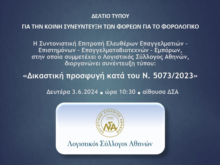 Η Συντονιστική Επιτροπή Ελευθέρων Επαγγελματιών – Επιστημόνων – Επαγγελματοβιοτεχνών – Εμπόρων, στην οποία συμμετέχει ο #Λογιστικός_Σύλλογος_Αθηνών, διοργανώνει συνέντευξη τύπου, τη Δευτέρα 3.6.2024 και ώρα 10:30 στην αίθουσα εκδηλώσεων του #Δικηγορικού_Συλλόγου_Αθηνών «Μιχάλη Επάμ. Ζαφειρόπουλου» με θέμα: