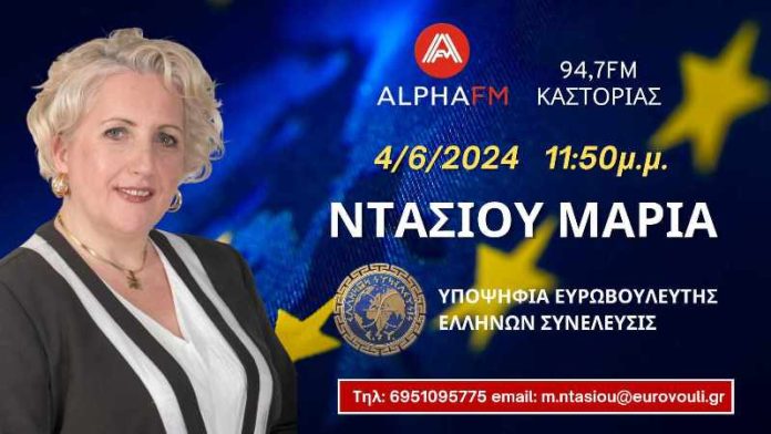 Η Υποψήφια Ευρωβουλευτής με τον Πολιτικό Φορέα Ελλήνων Συνέλευσις Μαρία Ντάσιου στον ALPHA 94,7 Καστοριάς Τρίτη 4 Ιουνίου 2024.