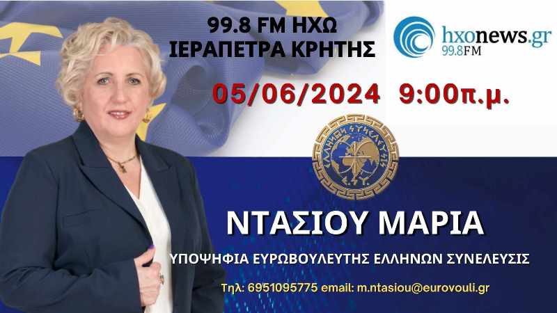 Η Υποψήφια Ευρωβουλευτής με τον Πολιτικό Φορέα Ελλήνων Συνέλευσις Μαρία Ντάσιου στο ΡΑΔΙΟ ΗΧΩ ΚΡΗΤΗΣ 99,8 Τετάρτη 5 Ιουνίου 2024.