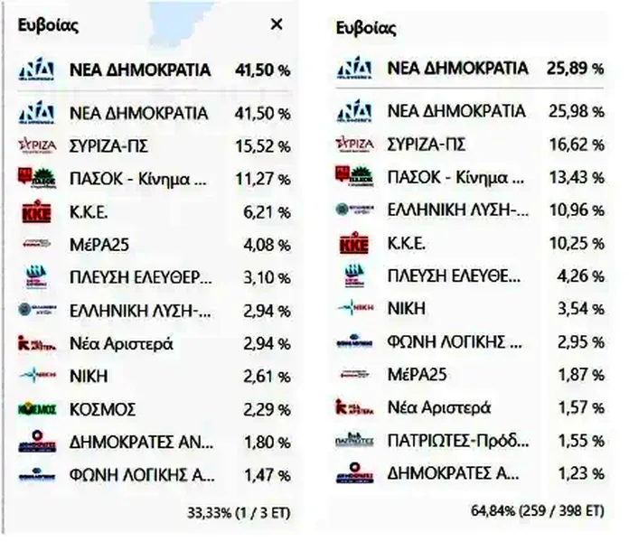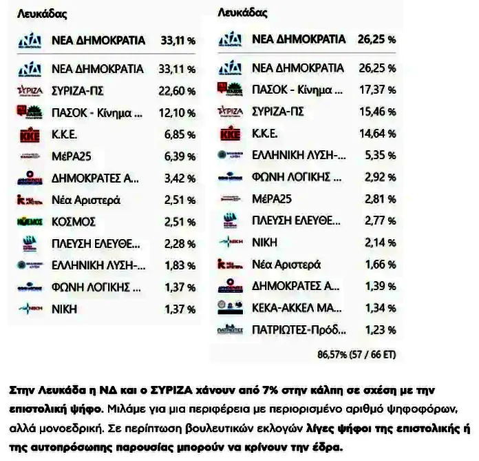 Η Νέα Δημοκρατία από το 54,29% της επιστολικής προσγειώνεται στο 32,31%. Όλα τα άλλα κόμματα φυσικά χάνουν σε σχέση με την κάλπη.