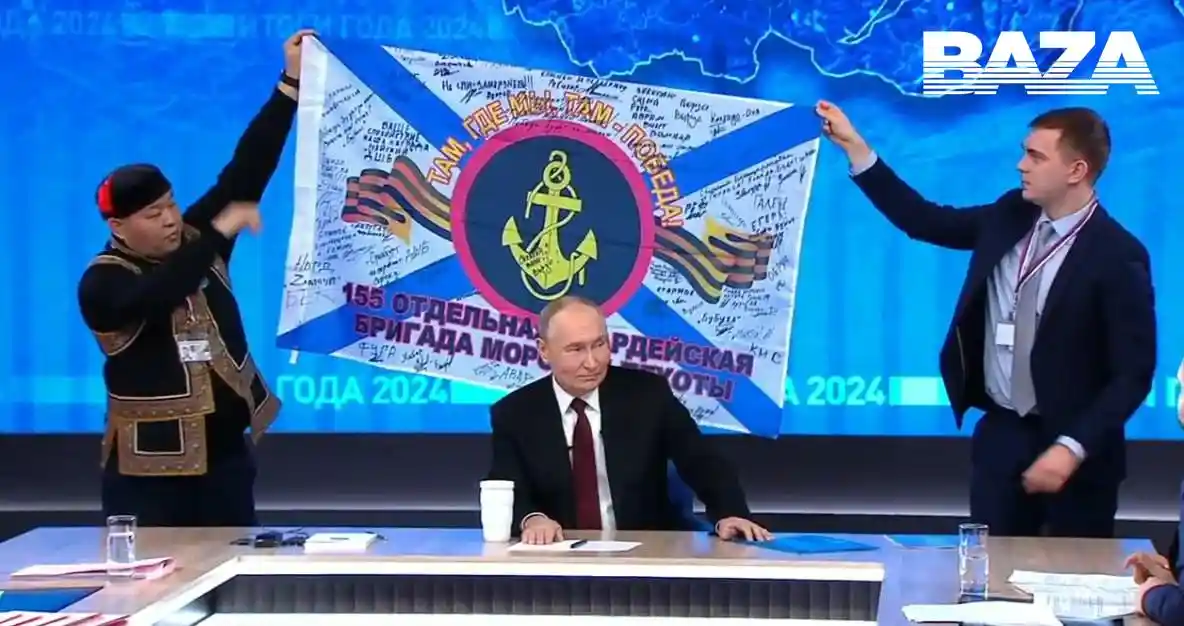 Ο Β.Πούτιν και ενώ διεξάγεται η ετήσια συνέντευξη, ξεδίπλωσε πριν από λίγο μπροστά στις κάμερες την σημαία της 155ης Ταξιαρχίας Πεζοναυτών του Στόλου του Ειρηνικού και δήλωσε ότι οι ρωσικές δυνάμεις νικούν σε όλα τα μέτωπα της Ουκρανίας όπως και στο ρωσικό Κουρσκ όπου απομένουν περίπου 300 τ.χλμ. υπό την κατοχή των Ουκρανών.