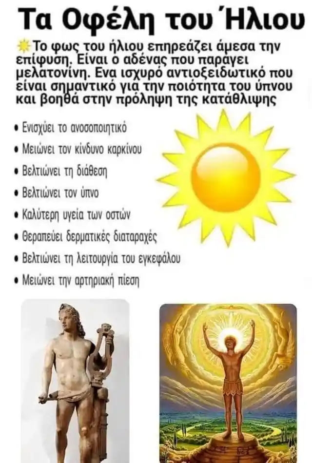 Όσοι όμως άνθρωποι δεν ακολούθησαν τις οδηγίες των ειδικών αψηφώντας τους με αποτέλεσμα την έκθεση τους στον ήλιο και εφόσον δεν χρησιμοποίησαν αντιηλιακα και γυαλιά ηλίου, διαπίστωσαν τελικά ότι ο ήλιος όχι μόνο δεν τους βλάπτει, αλλά αντίθετα τους ανταμείβει πλουσιοπάροχα.