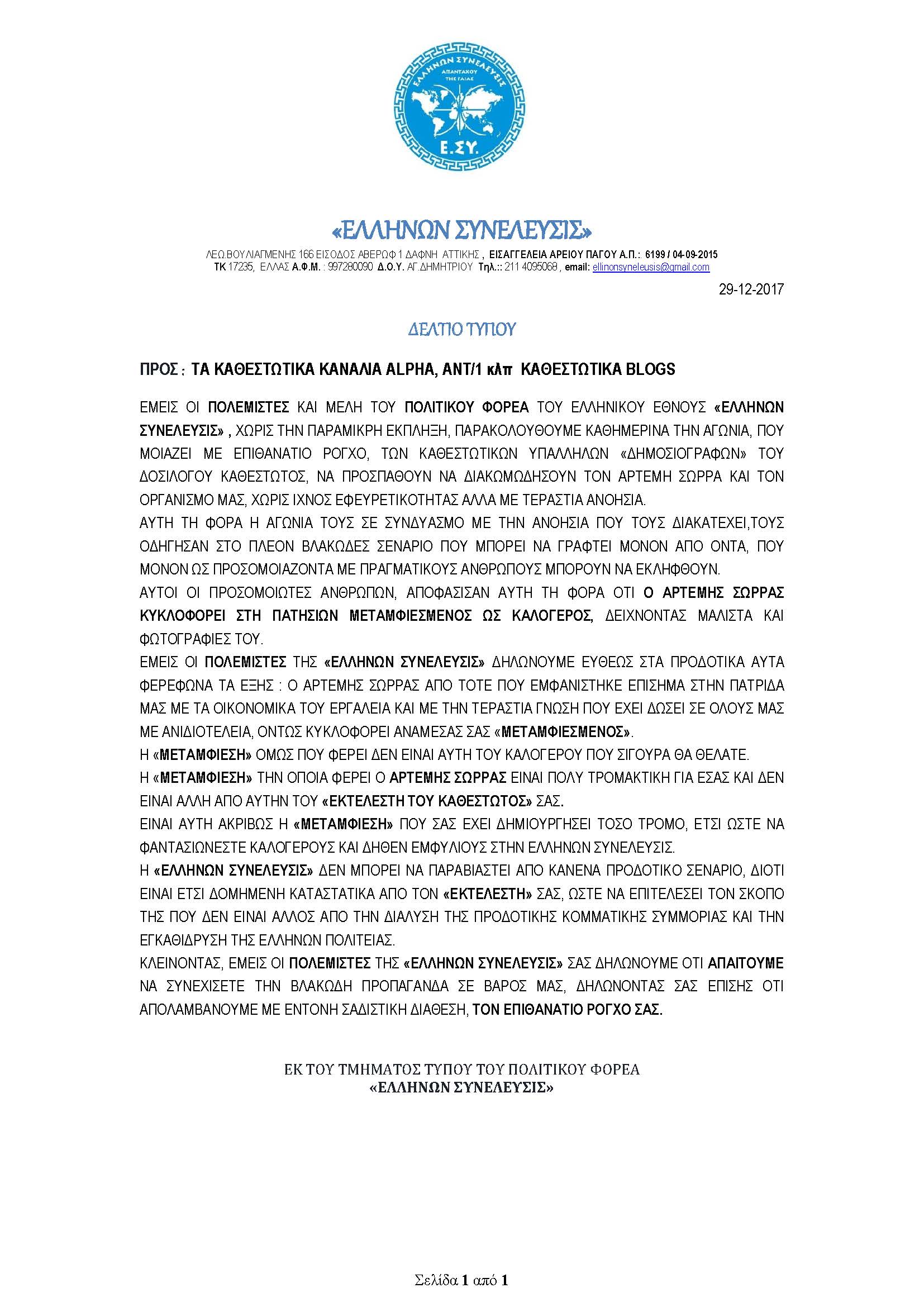 ΕΜΕΙΣ ΟΙ ΠΟΛΕΜΙΣΤΕΣ ΚΑΙ ΜΕΛΗ ΤΟΥ ΠΟΛΙΤΙΚΟΥ ΦΟΡΕΑ ΤΟΥ ΕΛΛΗΝΙΚΟΥ ΕΘΝΟΥΣ ΄΄ΕΛΛΗΝΩΝ ΣΥΝΕΛΕΥΣΙΣ΄΄, ΧΩΡΙΣ ΤΗΝ ΠΑΡΑΜΙΚΡΗ ΕΚΠΛΗΞΗ, ΠΑΡΑΚΟΛΟΥΘΟΥΜΕ ΚΑΘΗΜΕΡΙΝΑ ΤΗΝ ΑΓΩΝΙΑ, ΠΟΥ ΜΟΙΑΖΕΙ ΜΕ ΕΠΙΘΑΝΑΤΙΟ ΡΟΓΧΟ, ΤΩΝ ΚΑΘΕΣΤΩΤΙΚΩΝ ΥΠΑΛΛΗΛΩΝ ΄΄ΔΗΜΟΣΙΟΓΡΑΦΩΝ΄΄ ΤΟΥ ΔΟΣΙΛΟΓΟΥ ΚΑΘΕΣΤΩΤΟΣ, ΝΑ ΠΡΟΣΠΑΘΟΥΝ ΝΑ ΔΙΑΚΩΜΩΔΗΣΟΥΝ ΤΟΝ ΑΡΤΕΜΗ ΣΩΡΡΑ ΚΑΙ ΤΟΝ ΟΡΓΑΝΙΣΜΟ ΜΑΣ, ΧΩΡΙΣ ΙΧΝΟΣ ΕΦΕΥΡΕΤΙΚΟΤΗΤΑΣ ΑΛΛΑ ΜΕ ΤΕΡΑΣΤΙΑ ΑΝΟΗΣΙΑ.
